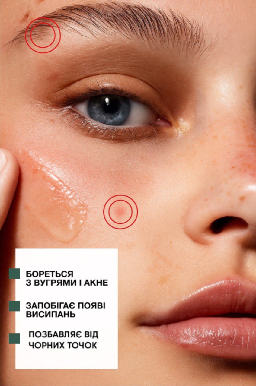 Очищає пори, бореться з акне та запобігає повторним висипам. Зменшує почервоніння та запалення на обличчі та тілі.