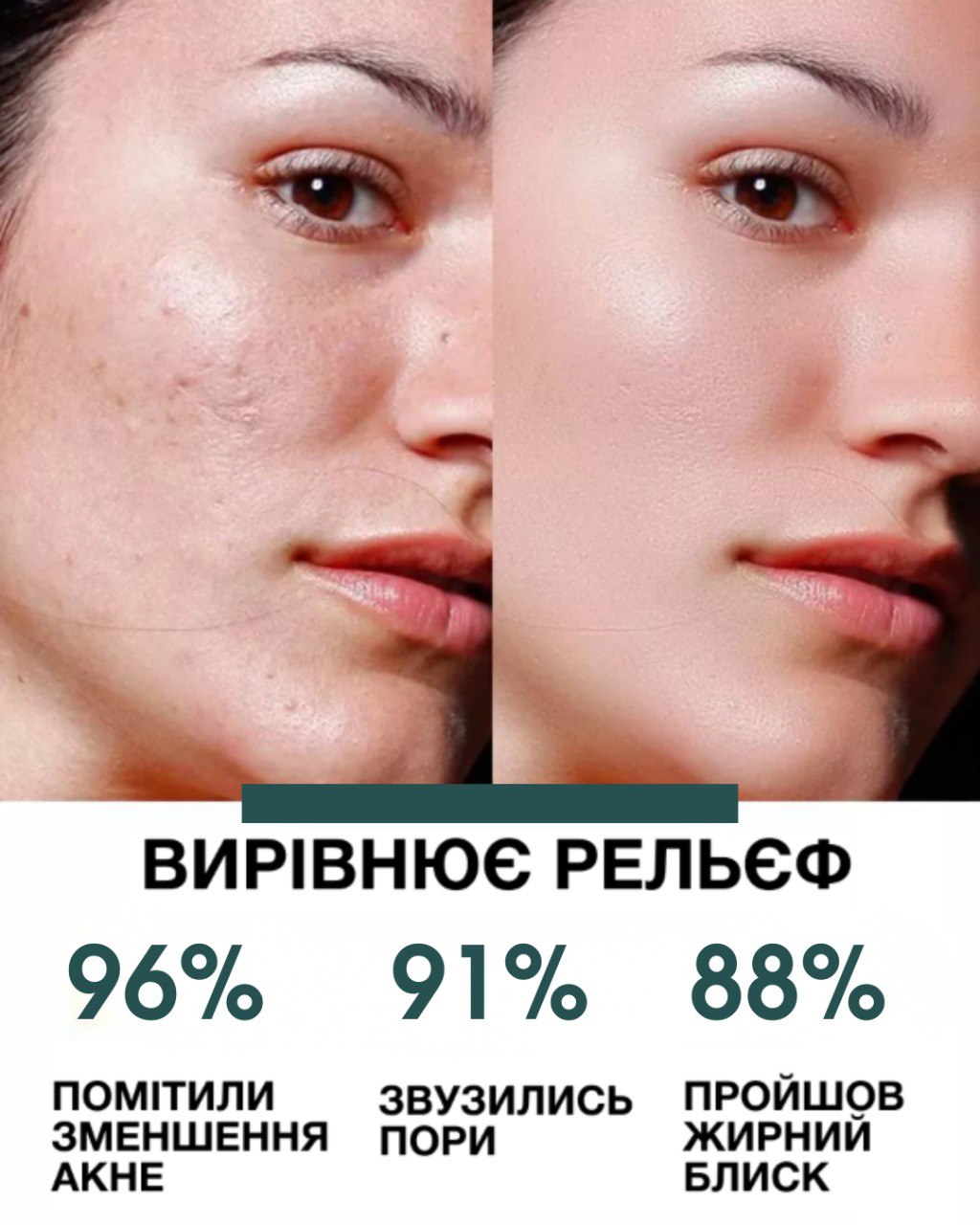Вирівнює тон шкіри, зменшує сліди пост-акне та покращує бар’єрні функції шкіри, роблячи її більш гладкою та здоровою.